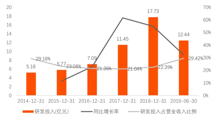 2019年上半年,科大讯飞研发投入为12.44亿元,同比增长32.15%,增速有所下降,研发投入在总营收中占比29.42%。总体来看,研发投入虽然在不断增加,但增速趋缓。