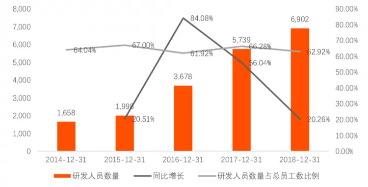 在研发投入上,为保证核心技术领先地位,科大讯飞不断加大研发投入及增加研发人员数量。2018年,科大讯飞研发人员数量增加至6902人,5年间增加了5244人,且人员比重一直保持在60%以上,但人员增速有所放缓。