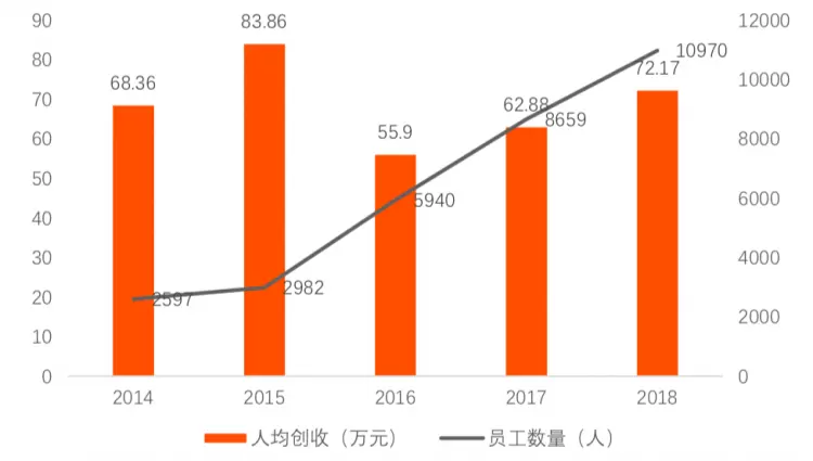 从人均效益来看,2017年以来科大讯飞的人均创收有所回升,2018年人均创收达到72.17万元,而科大讯飞在2018年年报中表示,根据发展战略所需招聘的关键人才和新增岗位已基本招聘就绪,人员增速会有所减缓,随着营收的快速增长,人均效益将会有所提升。