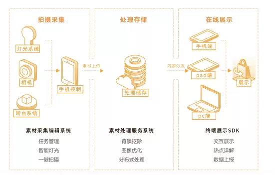 第二,在内容采集端,百度VR营销平台拥有广泛的硬件合作伙伴,能够针对不同品类的商品进行统一而高效的采集。“对于汽车和大型机械设备,我们可以提供大型的金属摄影棚;而对于一些珠宝玉器,我们也提供了与之相适应的小型采集设备。这些硬件设备与我们VR营销平台的SaaS系统打通,客户在采集端使用我们提供的APP就可以控制不同的硬件设备进行采集,采集完成之后数据上传到VR营销平台,然后进行统一的处理与分发。一般来说,商品的采集速度会因体积大小有所差异,比如最大型的车辆可以在5分钟之内完成采集,而一个戒指就只需要几十秒。在采集精度上,我们支持8K及以上分辨率,消费者可以在产品展示页通过放大图片看到更多细节,而我们在保证用户浏览商品消耗最小流量的同时,也实现了商品展示的最高清晰度。”