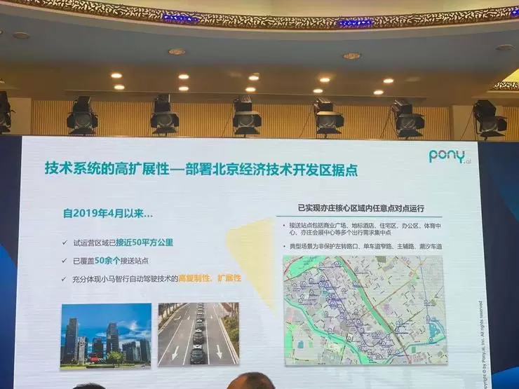 因此,2019年4月份我们在北京亦庄上线了Robotaxi服务,目前是差不多有接近50平方公里试运营区域,有50多个接送站点,也是覆盖了整个亦庄核心区域,包括主要的酒店、住宅区、办公区等。