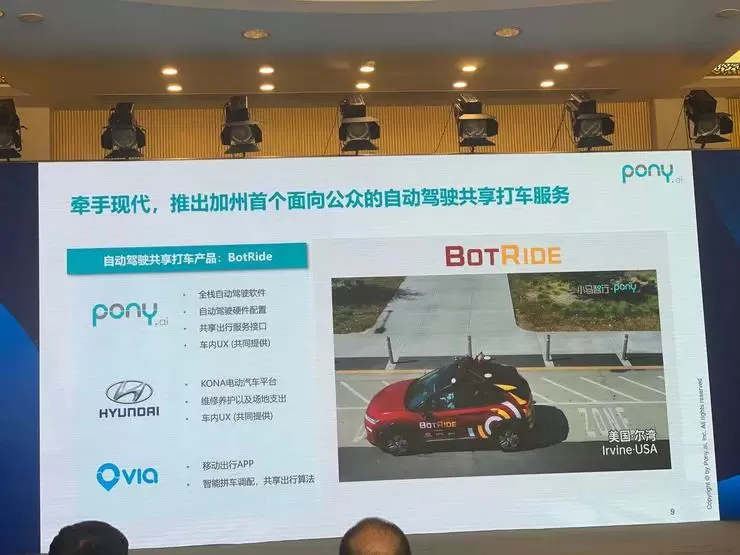 一方面是政策的原因,我们在加州取得了允许载客运营的牌照,所以我们和现代汽车在去年的10月份上线了叫做BotRide的服务,其中主要的群体是加州大学Irvine分校的学生。另外一方面的原因是,可以给当地居民作为平常出行的一个补充。