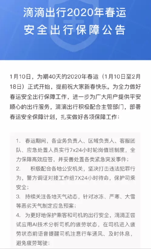 公告中还显示,春运期间,滴滴出行各业务负责人、区域负责人、客服团队、应急处置人员实行7x24小时轮岗值班制度,妥善处置各类紧急突发事件。同时,积极配合各地公安机关,坚决打击违法犯罪行为,警方调证对接工作组7x24小时待命,保护司乘安全。