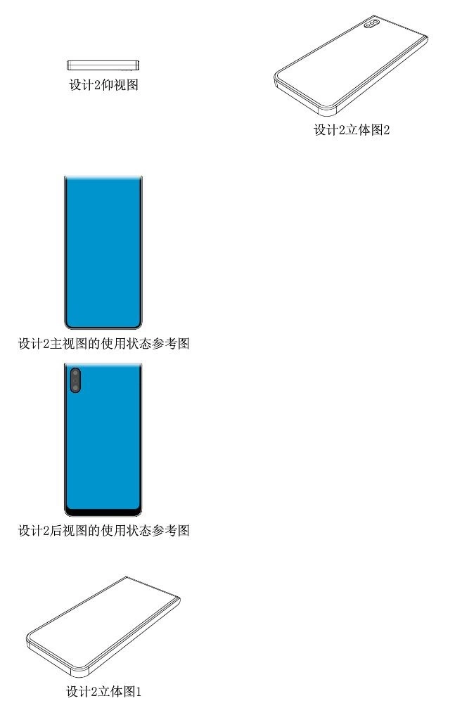 此外,还有一项新的手机外观设计,采用了前后双屏幕,屏幕的上方没有边框。从俯视图来看,中间有一条分割线,专利中没有说明是否为可折叠屏幕设计。