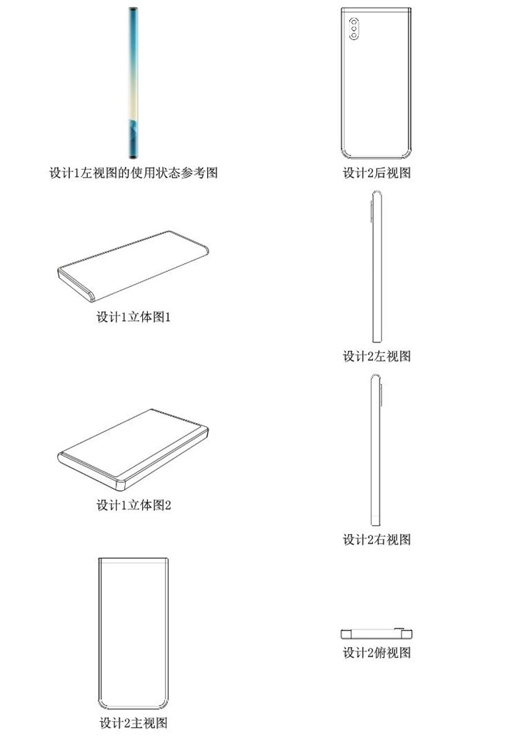 从专利中的设计草图可以看到,这款手机采用了三面环绕屏设计,除了前后屏幕,手机的右侧也为屏幕。手机的正面三边框看起来比较窄,没有看到前置摄像头;后置采用了双摄像头设计(有报道称该设计为可折叠屏幕,专利简要说明中并没有提到)。
