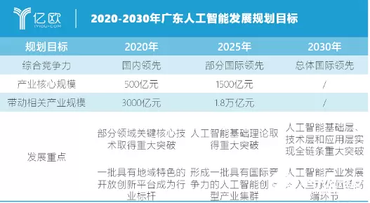 为何广东省会成为AI企业的“温床”?首先,依据《广东省新一代人工智能发展规划(2018-2030年)(征求意见稿)》规划,广东将分“三步走”:到2020年要处于国内领先水平,产业核心规模突破500亿元,带动相关产业规模达到3000亿元;到2025年人工智能产业核心规模要突破1500亿元,带动相关产业规模达1.8万亿元;而到2030年整个人工智能产业发展要进入全球价值链高端环节。