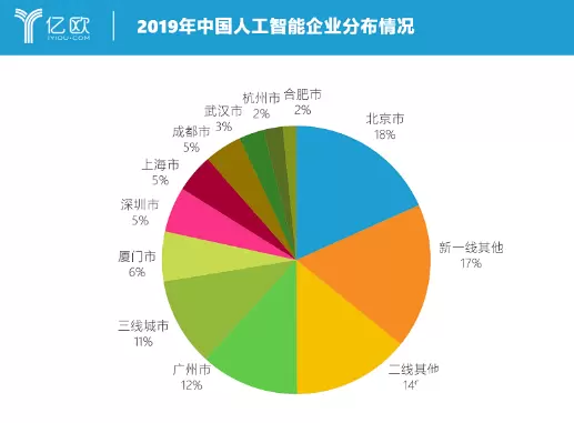 截止2019年11月20日,仅统计经营范围含“人工智能、机器人、数据处理、云计算、语言识别、图像识别、自然语言处理”的企业,由《2019中国AI创新报告》显示,除了新一线城市、二线城市、三线城市由多至少批量化分布,从具体城市分布上看,中国近82万家AI企业主要分布在北京、广州和厦门市。