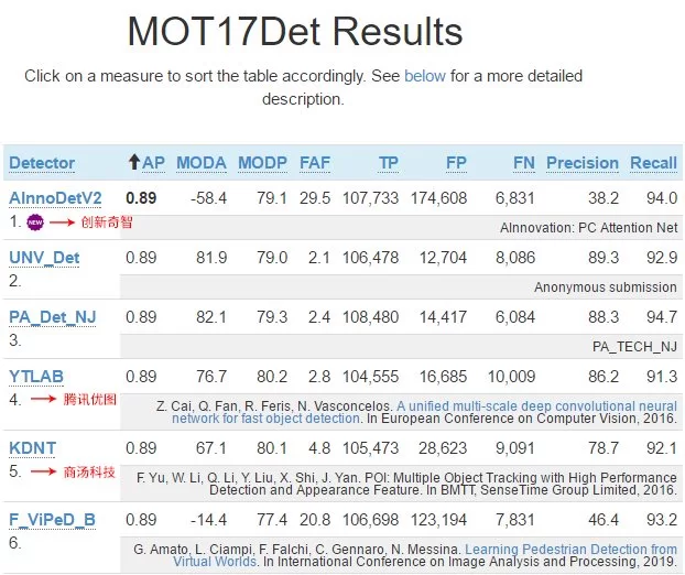 近日,创新奇智(AInnovation)在国际最权威的多目标跟踪挑战赛MOT(Multiple Object Tracking) Challenge,荣获MOT17Det多目标检测任务第1名的佳绩,以明显优势领先斯坦福大学、腾讯优图、商汤科技、海康威视等几十支强劲的国际企业和科研机构。