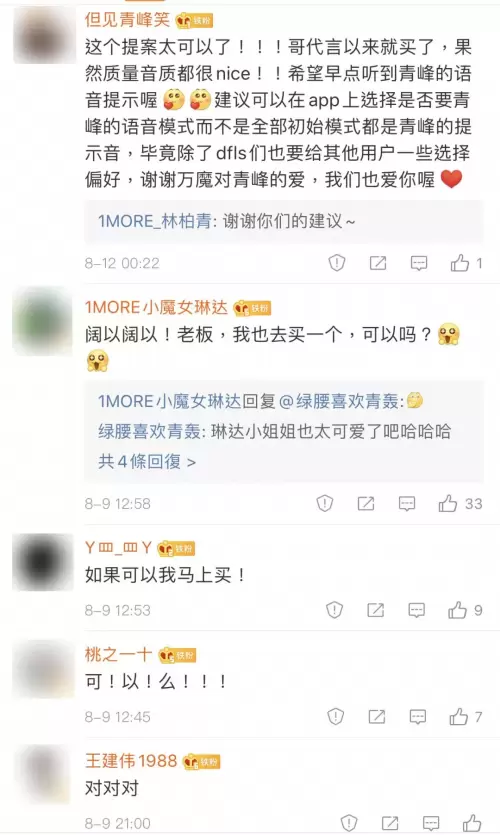 2019年8月9日,一位粉丝的“大胆想法”激起了众人的共鸣:1MORE耳机的蓝牙提示音如果是青峰录制,那会是怎样的神仙体验?颇有创意的想法让无数粉丝纷纷点赞。