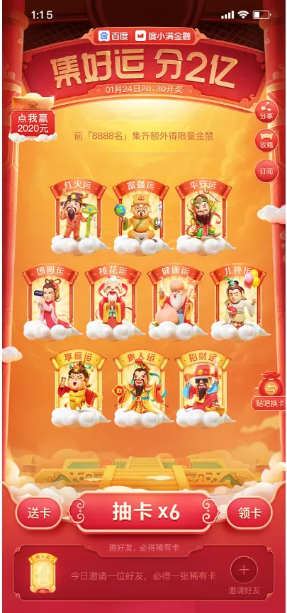 百度好运中国年「集好运」活动,1月17日还将开启「拼好运 赢2020元」活动。用户还可将手中重复的好运卡进行每天最多十次的投注,单注奖金2020元,每天最高可赢得20200元。