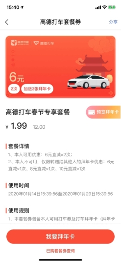 另外,在乘客端,高德打车也准备了数千万元的出行福利,将推出“春节专享套餐”活动,用户1.99元即可购买价值36元的打车券,其中包括2张6元直减的本人可用的打车券,以及可以转赠亲人朋友使用的6元、8元、10元直减各1张的拜年卡优惠券。
