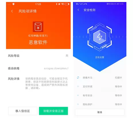 此前,西安市王女士就曾中招“抢红包”套路。她在网上下载了一款“红包神器”,刚开始确实抢到了不少红包,化身为群里的手速王。没过几天,她的手机就出现了问题,手机无缘无故锁屏,锁屏密码被修改,幸好及时维修才没有导致更大的损失。根据腾讯手机管家病毒查杀记录显示,“红包神器”软件潜藏名为“a.rogue.clownjokes.f”木马病毒,其病毒行为在于可能会锁定手机屏幕、修改手机锁屏密码,致使设备无法正常使用,进而造成财产损失和隐私泄露等严重后果。