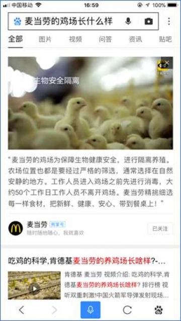 传统的搜索结果呈现方式往往还停留在文字或链接的阶段,但熊掌号为搜索结果提供了多种富媒体呈现样式,如文字、图片、视频、音频等,让优质内容能够得到更丰富且清晰的展示。例如在百度搜索“麦当劳的鸡场长什么样?”,用户看到的结果将不再是枯燥无味的文字描述,而是一段由麦当劳熊掌号提供的麦当劳养鸡场实景拍摄并穿插有鸡场场长、鸡肉供应商等相关采访的视频,麦当劳养鸡场的真实情况一目了然。