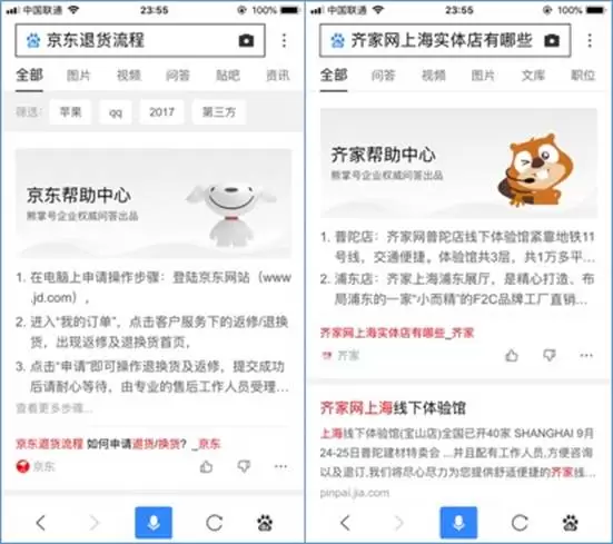 例如在客服场景上,用户可以直接搜索“京东退货流程”获取服务;在品牌宣传场景中,用户也可以直接在百度中搜索“齐家网上海实体店有哪些”来寻找齐家的门店。据悉,未来熊掌号还将推出包括产品专题页、隐藏下拉位等多种解决方案,帮助内容和服务提供者的优质内容实现更集中的曝光。