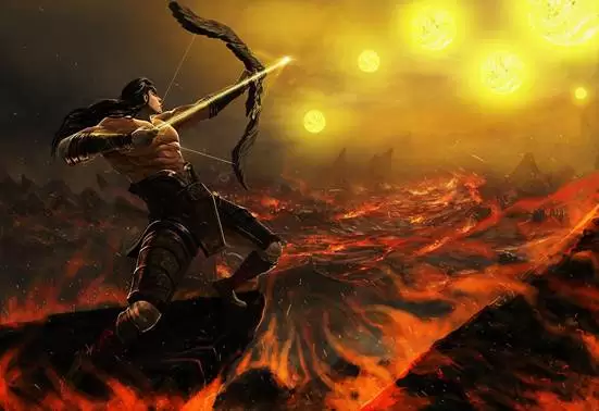 后羿,在年仅五岁的时候被父母抛弃在深山,自幼在山林中成长。他善于射箭,后来成为射师,被帝尧封于商丘,羿曾经帮助帝尧射下九日,匡扶黎民,后来他迎娶了帝喾之女嫦娥为妻。帝尧之时,天上有十个太阳同时出现,把土地都烤焦了,庄稼也干枯了,人们热得喘不过气来,倒在地上昏迷不醒。羿从肩上取下那红色的弓,抽出白色的箭,一支一支地向骄横的太阳射去,顷刻间十个太阳被射去了九个。从此地上气候适宜,万物得以生长。