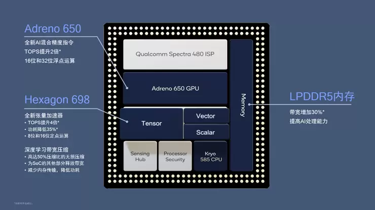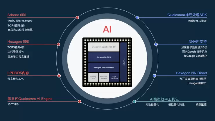 骁龙865 AI性能显著的提升并不是依靠某一个处理器的提升。AI Engine一直采用多核异构计算的解决方案,通过Kryo CPU、Adreno GPU、Hexagon处理器的协同处理,共同完成AI任务。第五代AI Engine核心的Hexagon处理器进行了全新升级,TOPS性能是前代张量加速器的4倍,运行能效同时提升35%。骁龙865的Adreno 650 GPU的AI算力相比于前代骁龙855的GPU AI算力也提升超过两倍,成为最强的手机AI处理器。