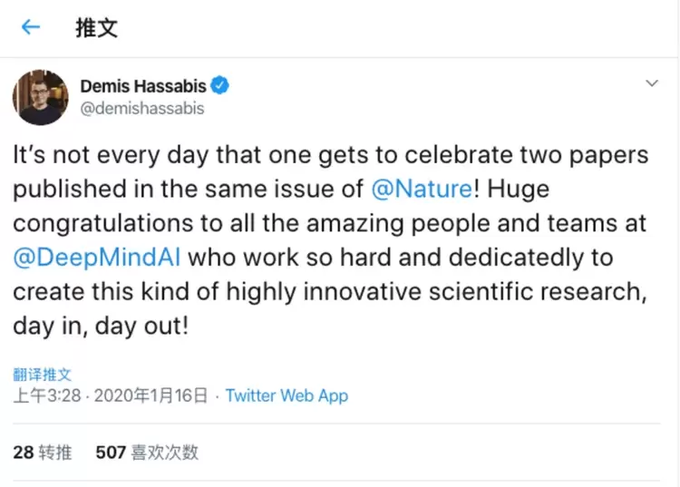 该论文发布之后,DeepMind 公司创始人 Demis Hassabis 非常兴奋的在其推文中表示: