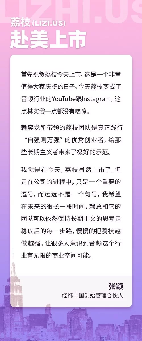 按下敲钟按钮后,荔枝创始人、CEO赖奕龙在纳斯达克现场进行了公开发言,他表示,对于公司而言,这是一个非常重要的时刻,是荔枝发展史上重要的里程碑。