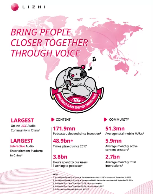 此外,根据艾瑞咨询数据,截至2019年9月30日,荔枝是中国最大的在线UGC音频社区;同时,就截至2019年前9个月的平均MAU而言,荔枝同样是中国最大的音频互动娱乐平台和第二大在线音频平台,分别占有的市场份额为70.7%和18.4%。截至2019年11月30日,平台已积累了超过1.7亿音频内容。2019年10-11月期间,平台月均活跃用户数超5100万,约590万月均活跃内容创作者,超过月均活跃用户总数的11.4%,用户平均月度互动次数约27亿次,其海量音频内容创作者群体、海量用户原创播客内容、语音直播及互动创新模式均为荔枝独有的特色。