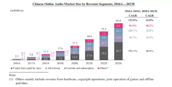 荔枝成功在美上市,不仅意味着荔枝在资本市场全新的起点,也为音频行业的发展前景和深入布局注入强心剂。艾瑞咨询数据显示,预计到2023年,中国在线音频用户规模将超9亿。目前音乐、游戏、在线视频的移动互联网用户渗透率已分别达到89%、82%、74%,而在线音频市场的渗透率仅为45.5%。由此可见,在移动互联网红利见顶的今天,在线音频是为数不多的仍存在巨大增长渗透空间的赛道。