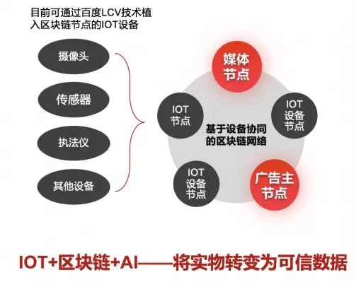 众所周知,区块链擅长解决上链数据防篡改,却难以保证上链前数据的真实性。百度超级链独创的轻量级节点(LCV)将区块链与物联网结合,提出了可信的区块链数据采集方式,安装了集成轻量级节点(LCV)的SDK后,线下广告屏幕就成为了智能化的区块链节点,所有播放数据上链可查,保证数据的真实性和不可篡改性,降低了区块链接入成本。在安全性上,保证在可信环境里采集数据,并多中心化记录。