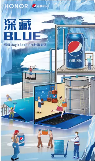 1月10日,@荣耀智慧生活 和 @华南百事可乐 在微博平台发布联名海报,宣布荣耀MagicBook Pro魅海星蓝携手百事可乐,共同发起主题为“深藏Blue”的跨界营销合作,瞬间引发了不少网友的热情关注和激烈讨论。