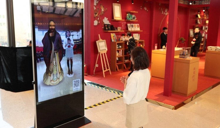 另一个 AR 互动式展项「孔庙祭孔」采用商汤 SenseAR 平台的手势识别、人脸识别等 AI+AR 技术。当观众走到展区时,与现实场景融合的孔子等比例虚拟人像出现,在观众摆出标准的「拜礼」手势向孔子回礼后,触发设备拍照合影。这样一来,观众就能拿到一张与孔夫子的合影照片。