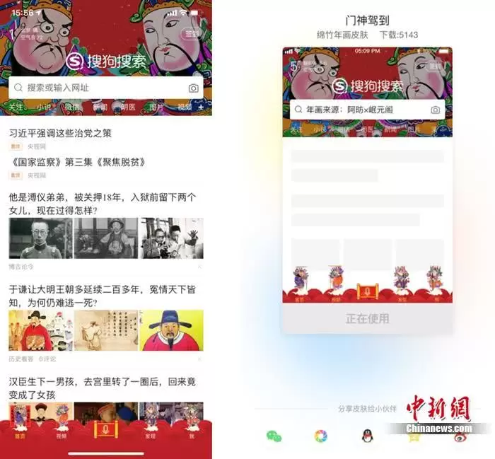 除此之外,此次合作还将年画元素应用于搜狗搜索APP的特色皮肤功能上,充分满足用户个性化的皮肤需求,高颜值、强趣味的形式让传统文化更加年轻化,进一步将年画技艺通过互联网产品的应用体验创新传承。