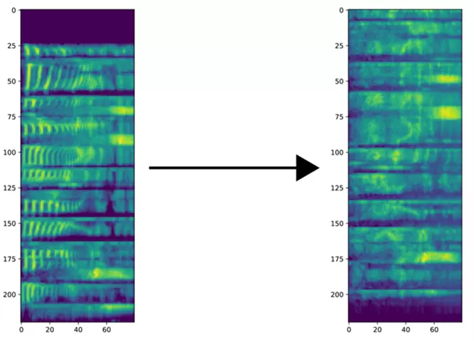 图:正常发声语音的声谱图(左),以及将低语-语音转换模型应用于此声谱图的结果。(图源:亚马逊)