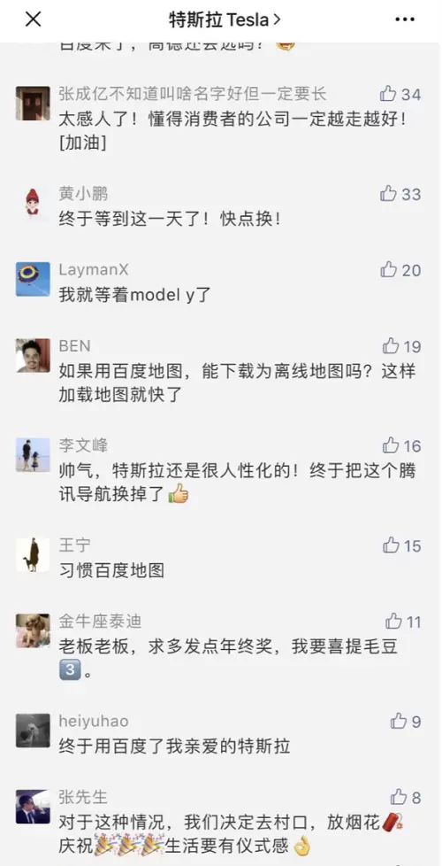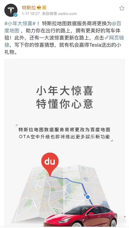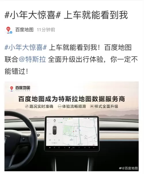 特斯拉官微表示:“特斯拉地图数据服务商将更换为@百度地图 ,助力你在出行的路上,拥有更美好的驾车体验!此外,还有一大波惊喜更新在路上。”