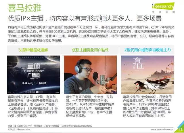 在内容开发上,喜马拉雅在多人剧、CP剧、有声剧、配乐有声书、评书有声书等音频样态上均做出了引领性的创新尝试,有声制作不再是以往"照本宣科"模式,越来越多"声音大片"开始涌现。《少年歌行》《有匪》《斗罗大陆》《从前有座灵剑山》《冰糖炖雪梨》等有声剧就因贴近原著和精彩演绎,受到"淑芬"们的喜爱。2019年,《三体》的同名广播剧大获成功,深受用户好评,也让外界看到了音频市场正在成为IP开发重要的策源地。