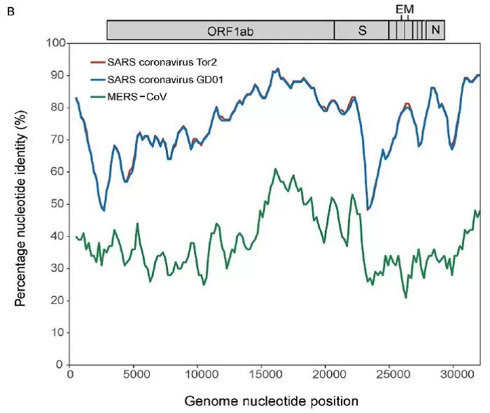 研究者通过对武汉新型冠状病毒基因组与2002年“非典”SARS冠状病毒、“中东呼吸综合征”MERS冠状病毒进行了全基因组比对,发现平均分别有~70%和~40%的序列相似性。其中不同冠状病毒与宿主细胞作用的关键spike基因(编码S-蛋白),有更大的差异性。