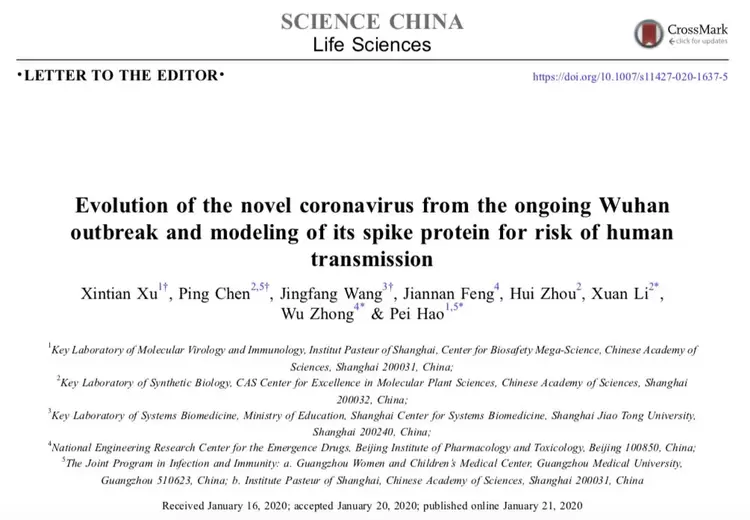 日前,中国科学院上海巴斯德研究所郝沛研究员、军事医学研究院国家应急防控药物工程技术研究中心钟武研究员和中科院分子植物卓越中心合成生物学重点实验室李轩研究员合作,在“SCIENCE CHINA Life Sciences”在线发表了一篇关于武汉新型冠状病毒的最新研究。