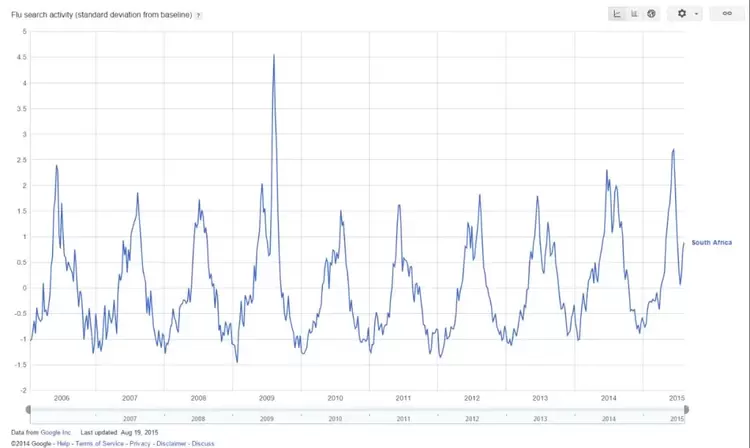 Google Flu发布的2008-2015年南非的流感搜索活跃度,目前该项目已下线