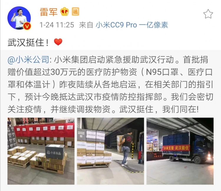小米启动紧急援助武汉行动:首批捐赠价值超30万元医疗防护物资已运往武汉