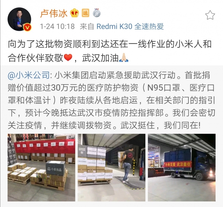 小米集团副总裁、中国区总裁、Redmi品牌总经理卢伟冰转发该微博表示:“向为了这批物资顺利到达还在一线作业的小米人和合作伙伴致敬,武汉加油!”