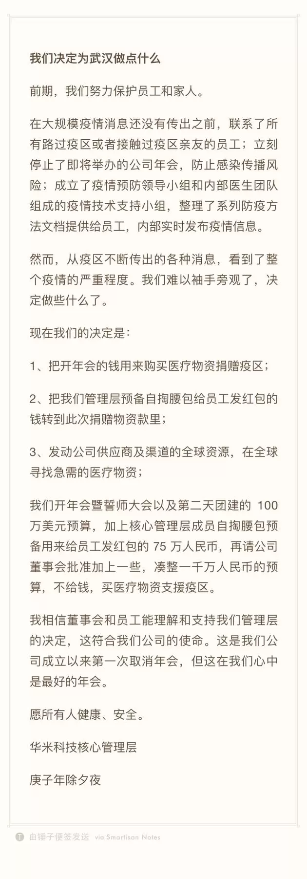 黄汪表示,华米决定取消公司年会,把钱省出来,加上高管捐赠及公司董事会批准,凑足1000万人民币用于全球购买紧缺医疗物资支援疫区。