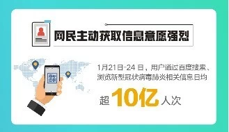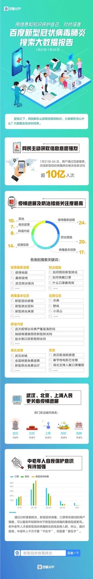 大年初一,百度正式发布新型冠状病毒肺炎搜索大数据报告。报告显示,21日以来,用户通过百度搜索、浏览新型冠状病毒肺炎相关信息日均超过10亿人次,疫情进展和防治措施是大家最关注的内容,而作为发病高危人群的中老年人,目前对于疫情的重视程度仍然不足,亟待加强。