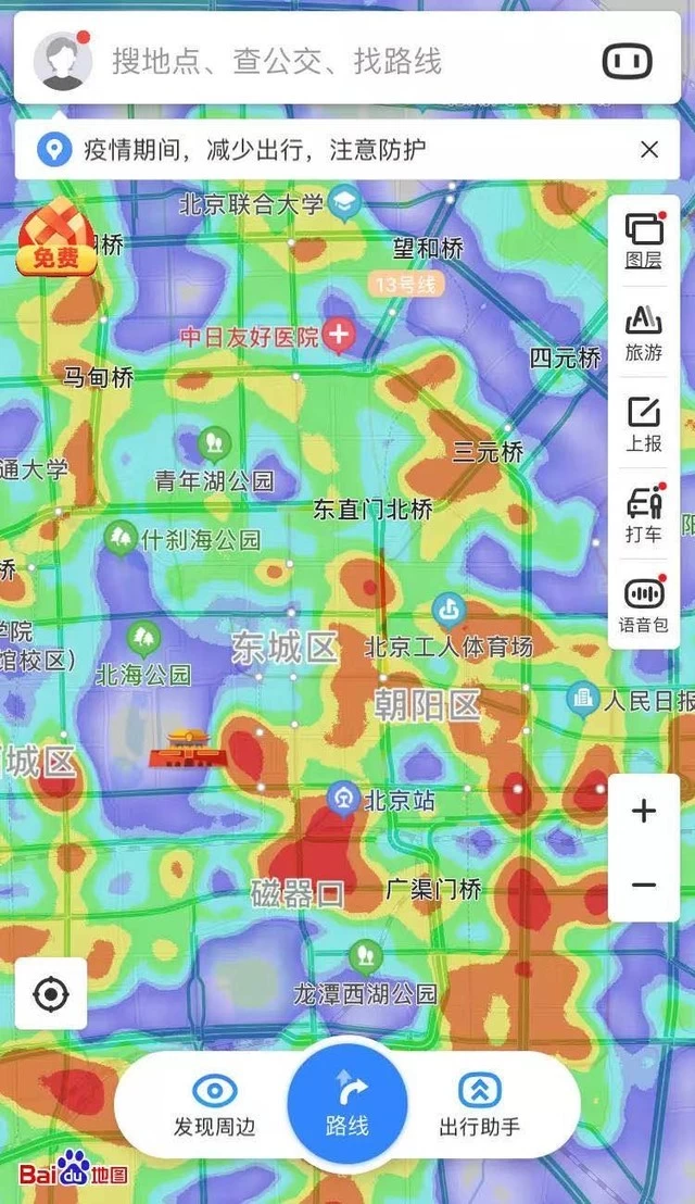 同时,依托于卫健委官方数据,百度还在北京、上海、武汉、成都四大城市上线了“发热门诊地图”,用户通过百度地图APP搜索“发热门诊”,即可查看附近发热门诊具体位置并规划合理的交通方式;用户还可以通过百度地图中的热力图图层,查看不同区域实时人口密度,从而在春节假期期间避开人流量多的商圈等地,降低疫情进一步扩散的潜在风险。