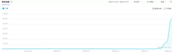 时下又恰逢春运高峰期,口罩生产厂家基本进入停工状态,药店、便利店等线下渠道和各大电商平台等线上渠道的口罩库存基本也已消耗殆尽,很多人一时间陷入了买口罩无门的境地。据百度指数显示,口罩的搜索指数从20日起迎来急速上扬,也侧面印证了目前全国多地口罩脱硝断货的实际情况。