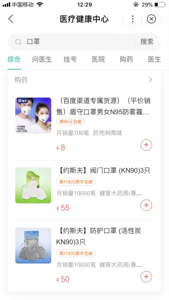 另外,用户还可以通过下拉百度APP首页进入百度智能小程序页面,搜索“医疗健康中心”进入该小程序后再搜索“口罩”,同样可以跳转至口罩购买页面,既有上面提到的N95口罩,也有其他类型的口罩。