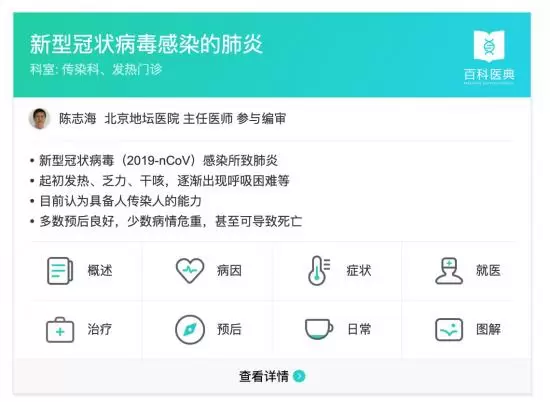 而关于此次新型冠状病毒肺炎,人们只要想了解发病的病因、传染路劲、防护措施以及目前的整体情况,打开百度,输入新型冠状病毒,就可以得到由专业人士编审的相关百科医典信息。