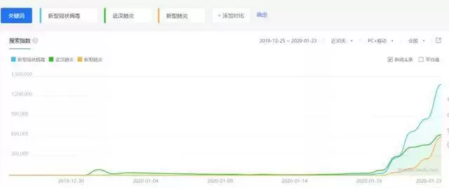 而背后,从百度搜索指数趋势看,用户对“新型冠状病毒”的搜索量出现激增。 仅仅在1月21日,两天内“新型冠状病毒+新型肺炎+武汉肺炎”三大关键词搜索指数较之前日均值上涨近100倍。而“新型冠状病毒”在近5日内搜索指数提升3342%。