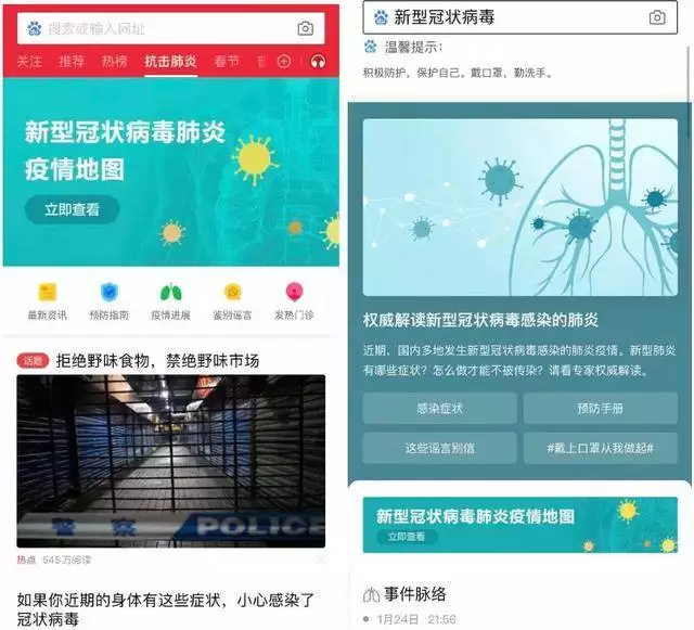 “武汉肺炎”相关的搜索词暴涨背后,具备媒体属性的百度也在主动迎战,针对用户核心的关注点以及对关键信息的需求,通过图文、视频、直播等多种形式,围绕事件最新进展、专家解读、预防方法等全面展现给用户。包括它上线了抗击肺炎频道、用户在百度搜索“新型肺炎”、新型冠状病毒”等关键词就可以进入到百度聚合页中,了解全面的权威信息与报道,并通过“鉴别谣言”栏目,积极辟谣。