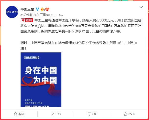 中国三星宣布:将捐赠3000万元,用于抗击疫情