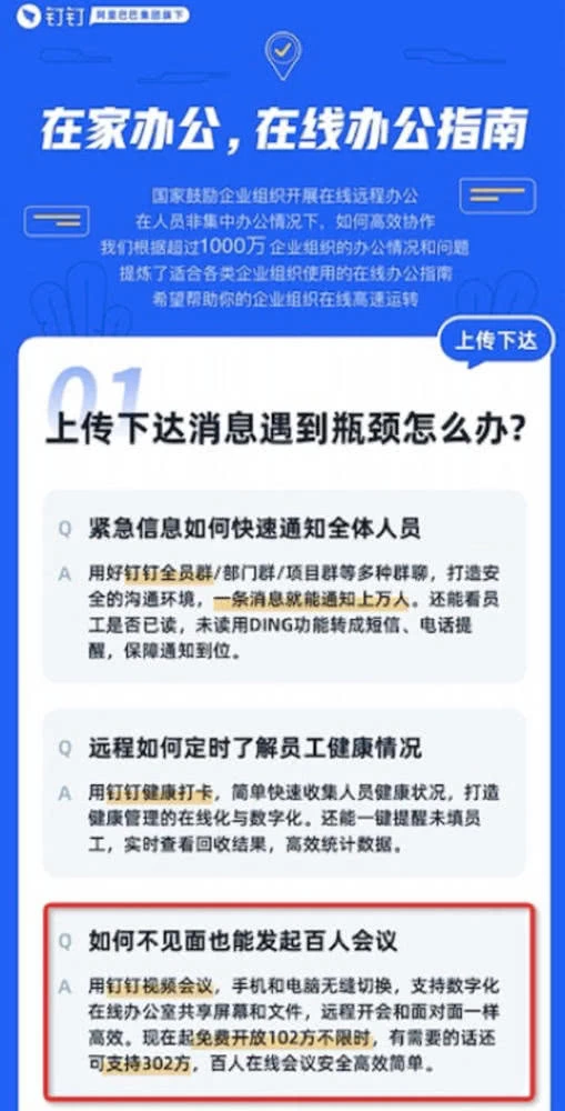 1月29日凌晨5点,阿里钉钉发布员工健康功能,员工可以健康打卡“报平安”,并免费开放百人视频会议功能,向1000万家企业免费开放全套的“在家办公”系统。据悉,目前已经有超过600万家企业组织在疫情期间调用钉钉的网上办公产品,其中视频会议是主需求。疫情期间,钉钉将视频会议升级到102方免费,免费视频会议最大可支撑302方。