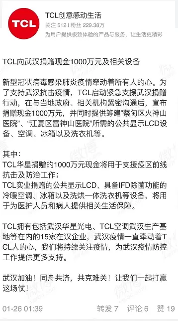 TCL宣布启动紧急支援武汉捐赠行动,向武汉捐赠现金1000万元,并同时提供筹建“蔡甸区火神山医院”、“江夏区雷神山医院”所需的公共显示LCD设备、空调、冰箱以及洗衣机等。以下为公告全文: