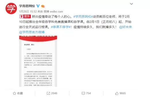 在此背景下,在线教育企业也纷纷行动起来,配合支持各地教育部门相关工作。1月26日下午,好未来旗下学而思网校官方微博宣布,将从2月10日起,推出从周一到周五与校内时间同步的全年级各学科免费直播课和自学课,向全国用户开放。自2月1日(正月初八)起,学而思网校开始进行全天试运行授课。
