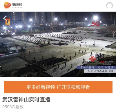 1月29日晚间,中国联通联合央视网进行的火神山、雷神山实时直播正式开通,可以登录央视网或央视影音客户端收看。中国联通5Gn live直播平台与5Gn“沃视频”客户端同步开通24小时直播。