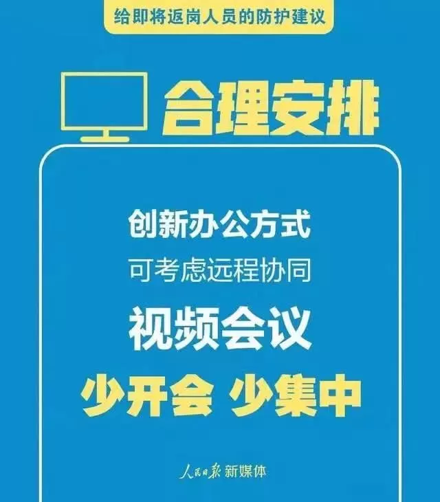 《人民日报》等官方媒体纷纷呼吁,在返程时全程佩戴口罩,在公司里不聚餐,下班后不去饭店或娱乐场所,尽可能采用在线办公、视频会议等科技手段,减少员工之间的正面接触,直到复工14天后,安全度过隔离期。